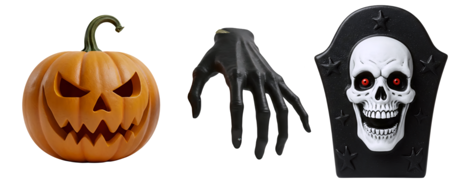 A spooky Halloween set with a carved jack-o'-lantern, a creepy zombie hand, and a grim reaper mask. This collection is perfect for a horror-themed party or haunted house concept.