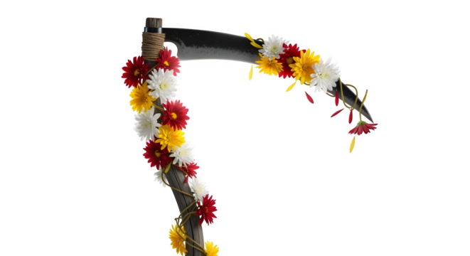 Grim reaper scythe adorned with chrysanthemum, isolated on white background