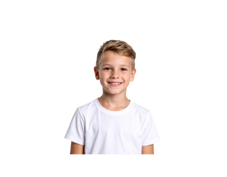 Smiling young boy with blonde hair wearing a plain white tshirt