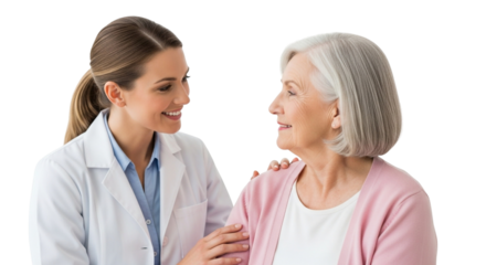 Caring physician comforting elderly patient in hospital bed with gentle smile and reassuring touch isolated on transparent background
