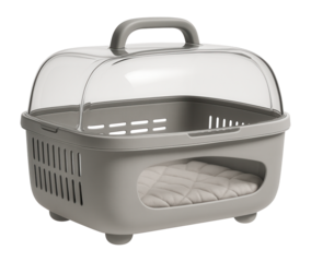 Plastic carrier with a see-through lid, perfect for reassuring pets during travel in a city apartment.