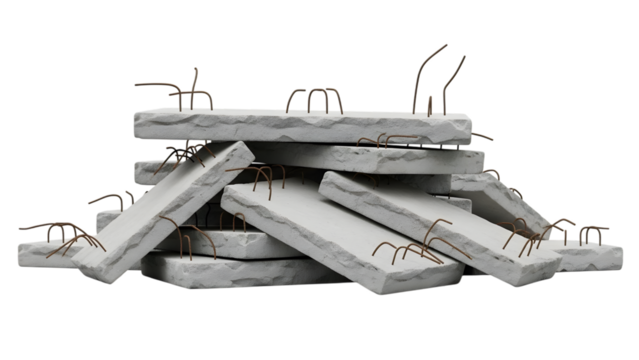 Stack of white marble or stone slabs with exposed rusty metal rebar isolated on a transparent background
