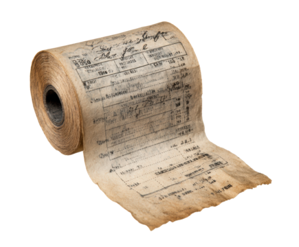 Old paper roll with vintage printed receipts for documentation purpose