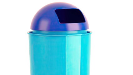 A tall, light blue plastic trash receptacle with a lid, set against a black backdrop