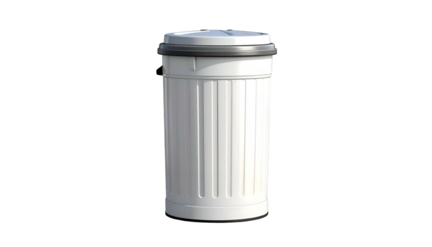 A white cylindrical trash receptacle with a lid, isolated on a stark black background