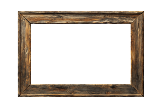 A rustic wooden picture frame with a weathered texture, isolated on a transparent background