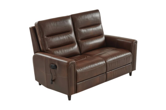 Elegant brown leather reclining loveseat with two seats, plush cushions, and manual recline mechanism, presented on a solid transparent background. background removed