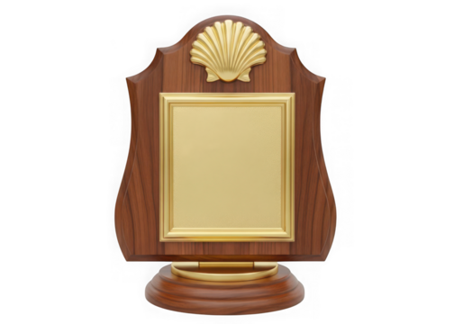 Wooden award plaque with gold frame and shell detail isolated on transparent background