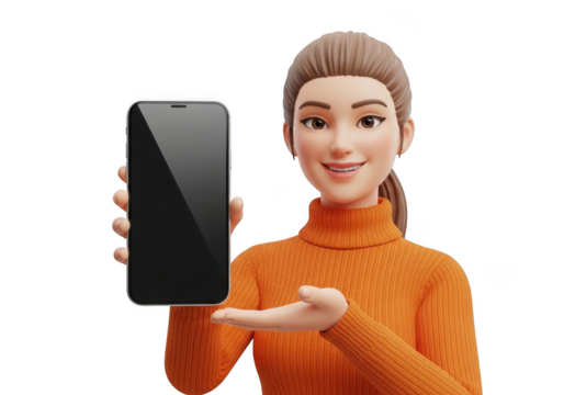 Smiling 3d woman presenting smartphone, isolated on transparent background
