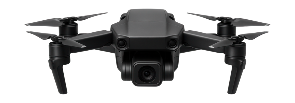 A white drone with four propellers and a camera mounted underneath, isolated on a transparent background