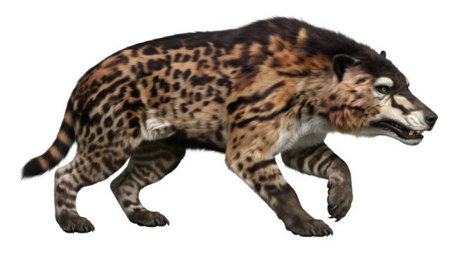 A digital reconstruction of the extinct prehistoric mammal Magericyon, a bear-dog predator with a spotted coat, isolated on a white background.