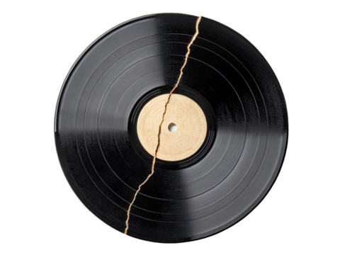 Damaged orange vinyl record PNG isolated on transparent background, vintage music disc with cracks and wear for retro design projects