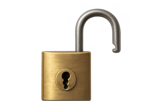 Open brass padlock with keyhole showing security, access, unlock, and protection concepts on transparent background