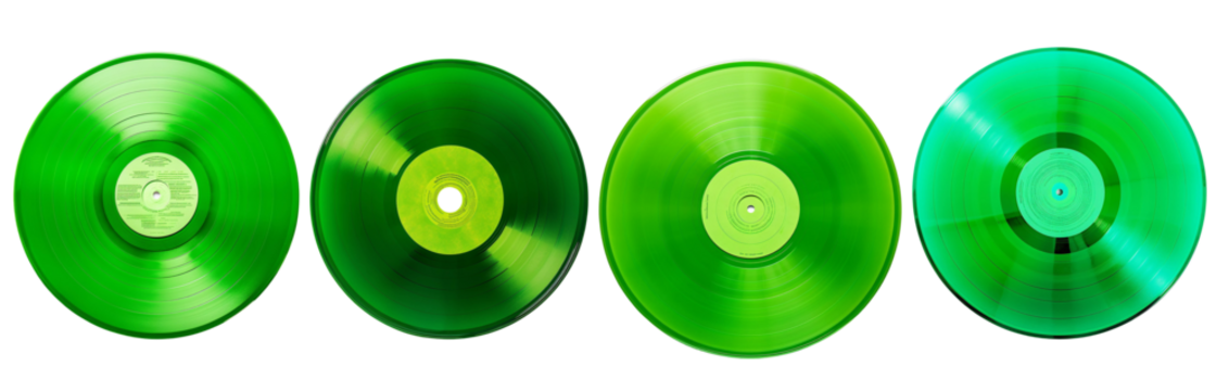 Four green vinyl records on a white background. Perfect for music, retro, and vintage-themed designs. High-quality and vibrant.