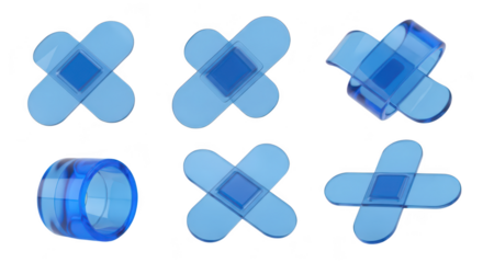 Blue transparent bandages arranged in various positions displayed on a white background symbolizing healing and protection suitable for medical illustrations
