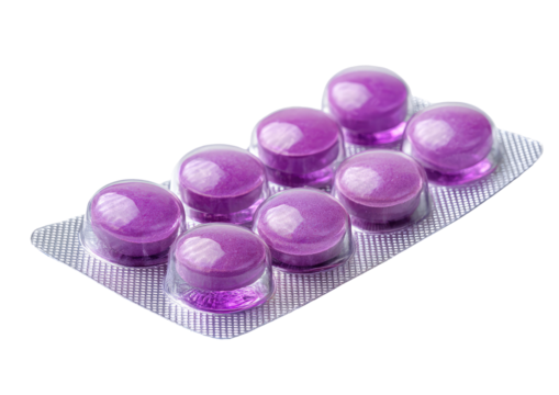 A blister pack containing eight shiny, purple, pill-shaped medications on a dark background