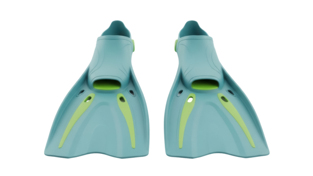 Pair of turquoise swim fins isolated PNG on transparent background, snorkeling equipment for water sports and recreational swimming