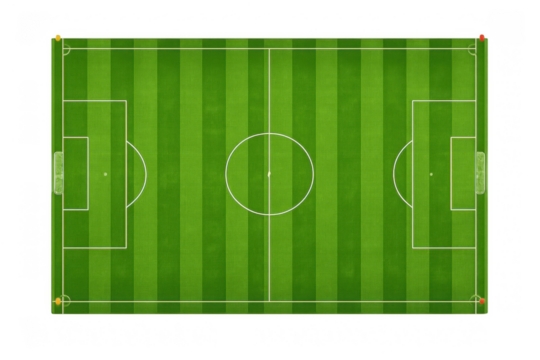 Soccer field showing a green grass texture with white lines, goal areas, and center circle from an aerial perspective