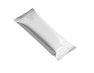 Blank white rectangular foil packet mockup for candy, biscuit, or small snack. Sealed flow pack wrapper template for food product packaging design. Isolated on transparent background, png