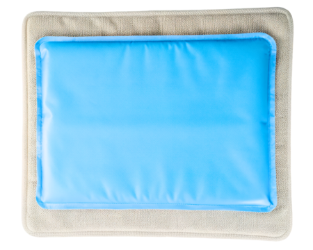 Blue rectangular gel cooling pad on a fabric mat on a transparent background