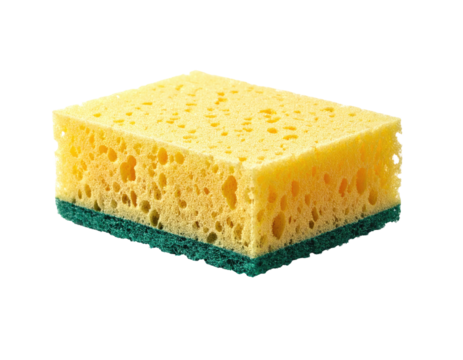 A rectangular cleaning tool with a yellow porous side and a green abrasive base
