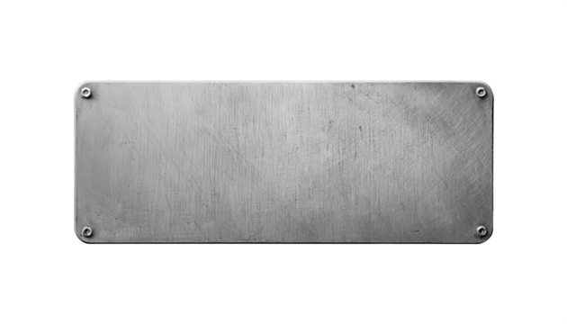 Brushed metal rectangular nameplate with rounded corners, isolated on transparent cutout background