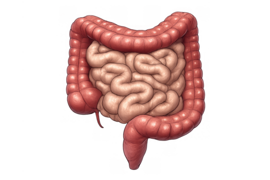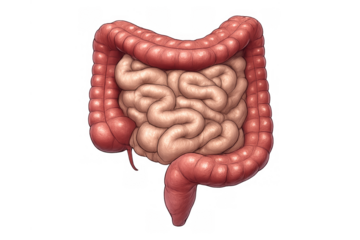 Human small and large intestine showing anatomical structure, digestive system, colon, and gut health on transparent background