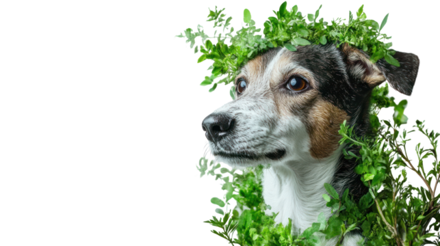 Eco-conscious lifestyle portrayed with a dog and green elements,isolated on transparent and white background.PNG image