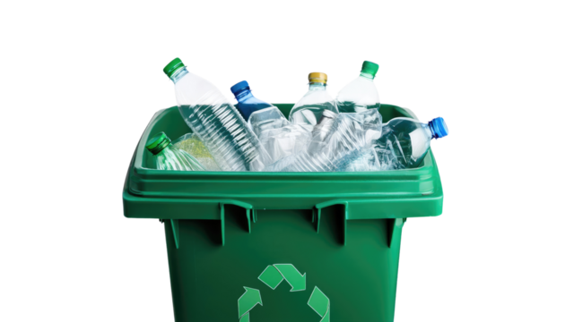 Green Recycling Bin Full of Plastic Bottles - Eco-Friendly Waste Sorting Stock Photo