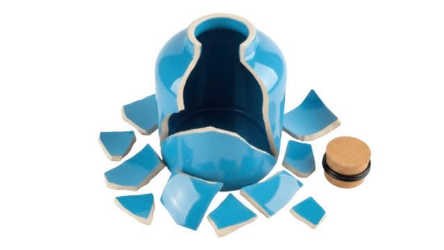Broken light blue ceramic vase with cork lid isolated PNG, shattered pottery pieces for repair or recycling concept on transparent background