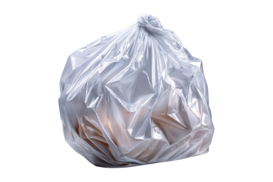 Waste Disposal: An object-level shot captures a clear plastic garbage bag, filled and tied, embodying disposal in a simple yet evocative composition. A symbol for modern refuse, urban living.