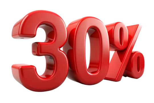 Shiny red 30 percent symbol 3d rendering isolated on white background isolated on a transparent background