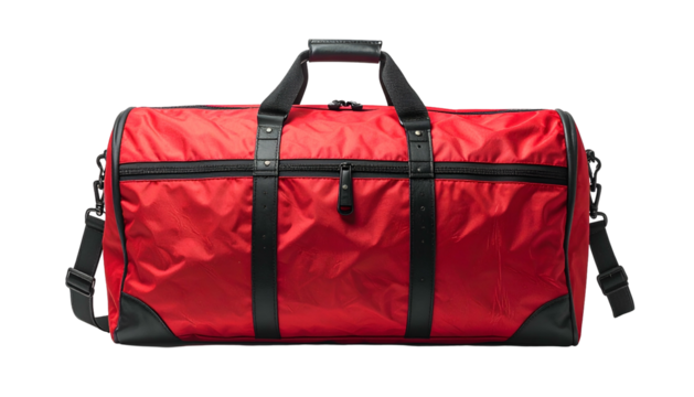 A bright red duffel bag with black accents, handles, and a shoulder strap