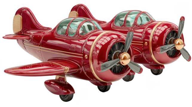 Two gleaming red vintage airplanes with chrome accents and bubble canopies isolated on transparent background