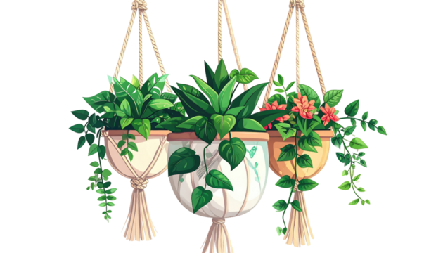 Three hanging planters, each filled with vibrant greenery. One has small red blooms. The pots are light-colored. Ropes suspend each plant