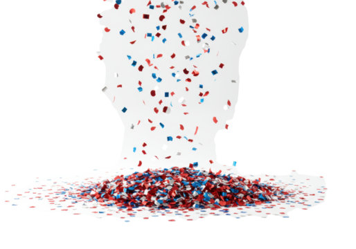 Red, silver, blue confetti, varied shapes and sizes, dynamically falling and scattering with a settled pile, against a transparent background with copy space, celebration atmosphere