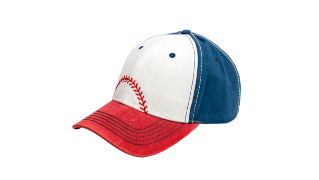 Baseball cap with white front and red brim designed with stitching patterns isolated on transparent background cut out