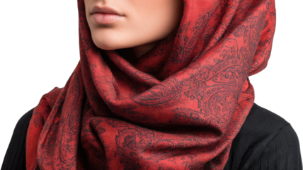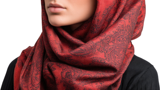 A cozy red winter scarf featuring detailed paisley design showcasing warmth elegance and seasonal fashion style on white background