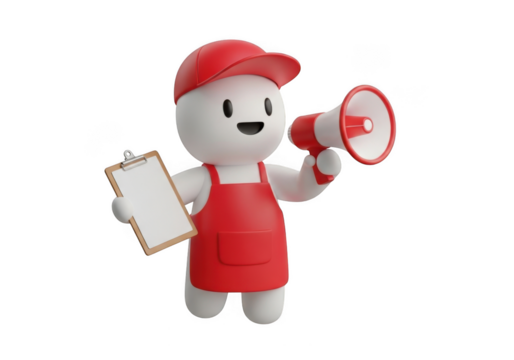 A cheerful cartoon character in a red apron holding a megaphone and clipboard isolated on transparent background