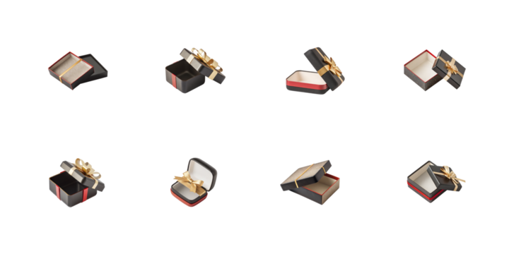 Collection of open black and red gift boxes with gold ribbons displayed at various angles on transparent background