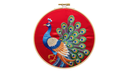 Vibrant peacock embroidery on red background displaying detailed feather design
