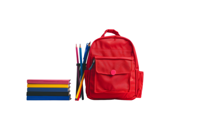 Red bag filled with assorted pills and red cross symbol representing medication or health care isolated on transparent background..