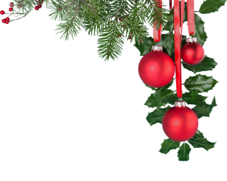christmas tree decorations with fir tree twigs, red balls, ribbon bow and golden gift tag lable isolated on white or transparent png
