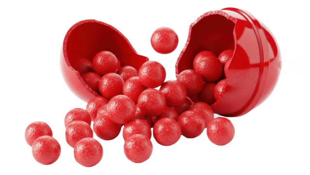 Red pill with a hole in it and a pile of red balls on the ground. isolated illustration on transparent background