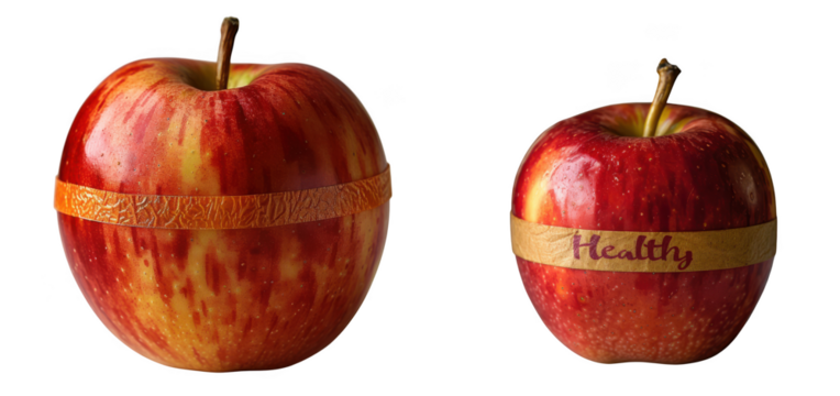 Two red apples, one large and one small, with a band around each, isolated on transparent background