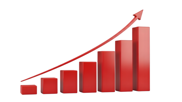 Shiny red bar graph ascending, indicating growth, with a dynamic upward pointing arrow