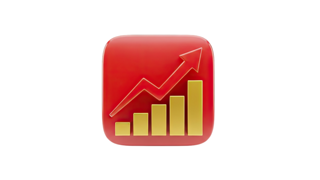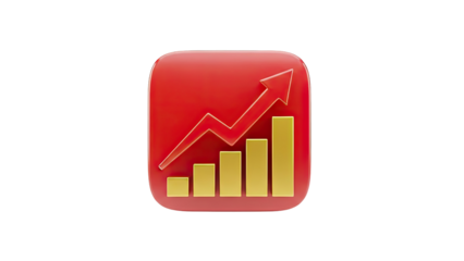 3D Red Icon with Golden Bar Graph and Upward Arrow on transparent background