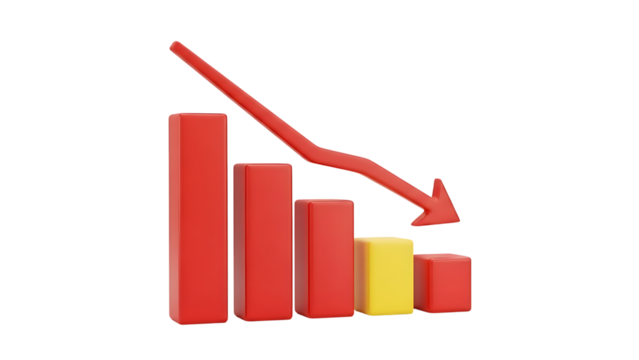 Red bar graph showing a decrease in value on a black background in a studio shot on transparent background