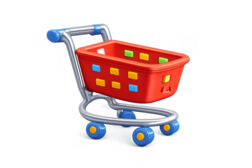 Shopping cart 3d rendering with red basket and colorful details on transparent background, symbolizing retail and online shopping