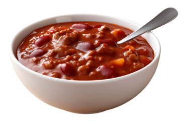Bowl of Red Bean Chili with Spoon on White or Transparent Background